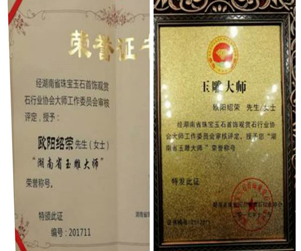 欧阳绍荣是郴州市工艺美术协会的副会长、市技师学院玉雕专业老师、市行业技术能手。他的作品荣获过国家级银奖1项、铜奖2项,省级金奖1项、银奖2项、铜奖1项。