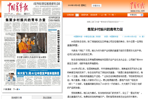 10月10日,岳阳民进会员张丞俊如利用新兴媒体创业扶贫的故事被《中国青年报》头版头条报道。